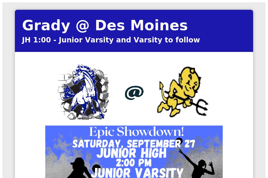 Grady @ Des Moines JH 1:00 - Junior Varsity and Varsity to follow